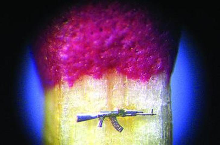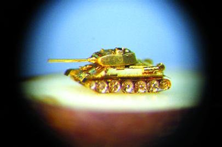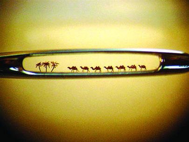 TTCT - Với nghệ sĩ điêu khắc siêu nhỏ người Nga Nikolai Aldunin, không chỉ một mà có đến bảy con lạc đà cùng đi qua một lỗ kim bé xíu. Tất cả kiệt tác của Aldunin đều không thể nhìn thấy bằng mắt thường mà phải ngắm bằng kính hiển vi hoặc kính lúp. Phóng to Nikolai Aldunin và những dụng cụ của ông Trong một tác phẩm khác, người ta thấy Aldunin trưng bày một khẩu AK-47 trên thân một que diêm. Để hoàn thiện tác phẩm độc đáo với 34 phần này, Aldunin phải mất sáu tháng ròng. Ông phải làm việc ban đêm, mang mặt nạ để hơi thở không thổi bay những phần mảnh mai của khẩu súng siêu nhỏ. Từng là thợ tiện kim loại suốt 25 năm trong nhà máy tại Tula, Aldunin lao vào nghiên cứu và sáng tạo nghệ thuật điêu khắc sau khi nghỉ việc. Một lần (năm 2002), lấy cảm hứng từ câu chuyện nổi tiếng về nhân vật Levsha của nhà văn Nikolai Semyonovich Leskov vào thế kỷ 19 (kể rằng Levsha từng đặt những chiếc móng ngựa trên một con bọ chét máy), Aldunin bắt năm con bọ chét từ con mèo hàng xóm rồi tìm cách dựng lại phiên bản được miêu tả trong truyện Leskov. Và Aldunin còn làm được nhiều hơn thế. Tác phẩm của ông không chỉ có bộ móng ngựa được gắn vào chân bọ chét mà ông còn làm bộ yên ngựa (có bàn đạp hẳn hoi) cũng gắn trên lưng bọ chét! Công cụ quan trọng nhất đối với ông là chiếc kính hiển vi Liên Xô sản xuất năm 1985. Ngoài ra còn một số dụng cụ khác như keo siêu dính, ống tiêm và tăm xỉa răng! Phóng to Bầy lạc đà chui qua lỗ kim Khẩu AK-47 trên thân que diêm Con bọ chét được thắng yên cương! Xe tăng siêu nhỏ nằm trên mặt hạt táo Chân dung đại văn hào LevTolstoy được khắc trên một hạt gạo Xe đạp trên một cây kim