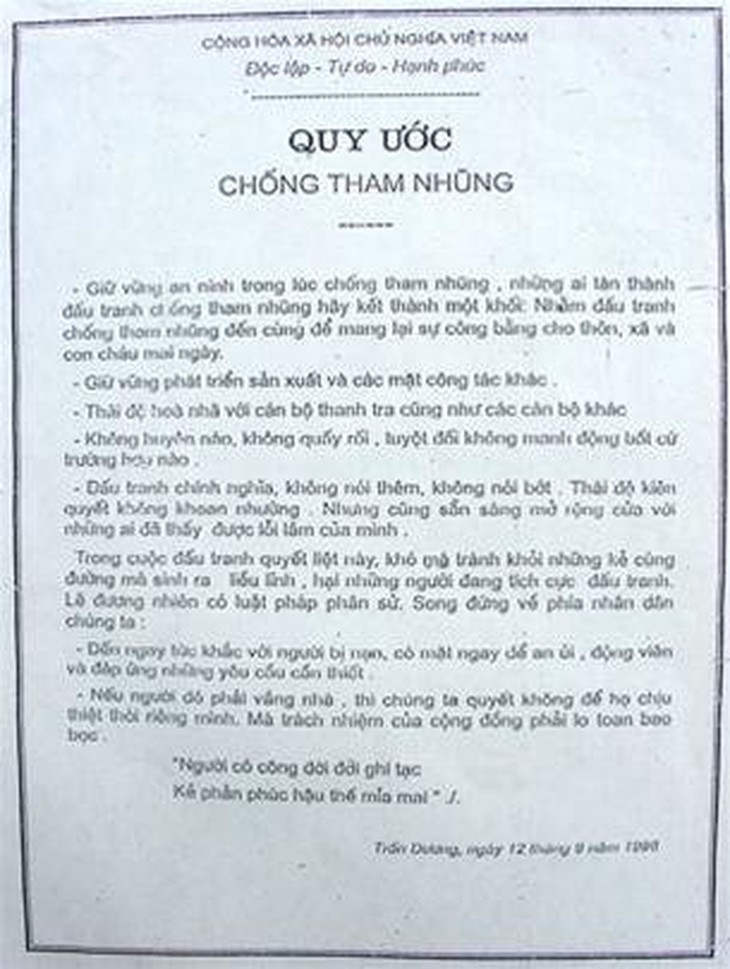 TTCT - Những người dân nghèo ở thôn Dương Tiền, xã Trấn Dương, huyện Vĩnh Bảo (TP Hải Phòng) đã cùng nhau phanh phui 17 vụ tiêu cực của địa phương với số tiền lên đến hàng tỉ đồng. Họ tuyên chiến với tiêu cực, tham nhũng bằng một “đội đặc nhiệm” của lòng dân... Phóng to Các thành viên trong đội chống tham nhũng ở thôn Dương TiềnTTCT - Những người dân nghèo ở thôn Dương Tiền, xã Trấn Dương, huyện Vĩnh Bảo (TP Hải Phòng) đã cùng nhau phanh phui 17 vụ tiêu cực của địa phương với số tiền lên đến hàng tỉ đồng. Họ tuyên chiến với tiêu cực, tham nhũng bằng một “đội đặc nhiệm” của lòng dân... “Chiều nay chắc lại có vụ việc gì rồi nên các cụ trong tổ chống tham nhũng thôn đang rủ nhau đi họp đấy. Hôm nào các cụ áo quần tươm tất là biết ngay đi họp” - chị chủ quán nước chè đầu thôn vừa nói vừa chỉ tay về phía một nhóm cụ già đang đạp xe trên đường làng. Thôn làng “dậy sóng” Khoảng sân rộng trước nhà ông Lâm đầy xe đạp, cánh cửa gian nhà chính mở toang. “Mọi khi họp hành ở nhà ông Thụy, nhưng hôm nay chỉ có các thành viên thường trực nên mới gặp ở nhà tôi” - ông Lâm, biệt danh “Lâm kiện”, nói rồi lần lượt giới thiệu từng người. Tấm phản lớn đặt giữa nhà trở nên quá chật chội với 20 cụ già đang ngồi quanh ấm nước chè bàn chuyện rôm rả. Chúng tôi ngỡ mình đang ở trong hội trường của cấp huyện vì những câu chuyện mà các cụ bàn luận hôm ấy đều là chuyện quốc gia đại sự. Những đôi tay thô ráp nhăn nheo, móng ố vì bùn đất, cầm một xấp giấy khá dày là những tờ đơn tố cáo, khiếu nại của người dân, văn bản báo cáo kết quả thanh tra, kiểm tra của công an, UBND, hồ sơ, tài liệu chứng cứ... “Công trình cả chục năm qua của anh em tổ chống tham nhũng chúng tôi đấy. Chứng cứ về sai phạm của nhiều lãnh đạo địa phương nằm hết trong này - ông Đỗ Văn Quảng, 70 tuổi, người được dân bầu làm trưởng ban chống tham nhũng thôn, lật từng trang giấy rồi cho biết thêm - Hơn 30 thành viên tổ chống tham nhũng thôn Dương Tiền này cùng sống chết, kiên quyết đấu tranh với những sai phạm của một số lãnh đạo xã”. Do mất mùa nên UBND thành phố Hải Phòng hỗ trợ dân Trấn Dương 70 tấn thóc nhưng xã chỉ phân phát 30 tấn, số còn lại cán bộ xã giữ chia nhau khiến người dân bất bình... Từ vụ việc này, các thành viên chống tham nhũng của thôn âm thầm điều tra và phát hiện thêm nhiều vụ tiêu cực khác. “Các quan xã coi trời bằng vung - ông Quảng nói - Đầu tiên các đảng viên trong chi bộ thôn Dương Tiền yêu cầu lãnh đạo xã giải thích. Nhưng xã cậy thế quan quyền yêu cầu phải có đầy đủ 29 chữ ký của các thành viên trong chi bộ. Chúng tôi thực hiện đầy đủ nhưng họ lại trở mặt không giải thích. Ông Kh. chủ tịch xã còn thách thức chúng tôi trước sự chứng kiến của hàng trăm người dân: Có giỏi thì cứ đi kiện...”. Chính từ đơn thư phản ánh của tổ chống tham nhũng ở Dương Tiền, cuối tháng 5-1999, Công an TP Hải Phòng đã tiến hành làm rõ những vi phạm của một số cán bộ chủ chốt của UBND xã Trấn Dương về lợi dụng chức vụ, quyền hạn, cố ý làm trái, chi tiêu sai nguyên tắc tổng số tiền gần 1,3 tỉ đồng. Ngoài ăn chặn gạo cứu trợ của nông dân, trong dự án xây lắp và cải tạo đường điện hạ thế 0,4kV của xã, lãnh đạo xã đã chia tiền cho nhiều cán bộ thôn, xã (tiền bên B cắt lại cho bên A). UBND xã còn tự ý phân lô bán vô tội vạ 135.500m2 đất (không được phép của TP Hải Phòng) làm thất thoát hàng trăm triệu đồng; lập khống hồ sơ di dân để lấy tiền chia chác nhau... Ngày 13-11-2000, một phiên tòa hình sự đã được mở ra để xét xử những tiêu cực của các quan xã Trấn Dương. Một số cán bộ Trấn Dương đã bị truy tố về tội lợi dụng chức vụ, quyền hạn và cố ý làm trái qui định nhà nước về quản lý kinh tế, gây hậu quả nghiêm trọng. Sau đó, phiên tòa được mở công khai, các cán bộ mắc sai phạm phải nhận các mức xử lý: bí thư Đảng ủy xã bị cảnh cáo, cách chức; chủ tịch UBND xã bị khai trừ khỏi Đảng và nhận mức án 45 tháng tù, cùng nhiều cán bộ xã đều lãnh án. “Hương ước” chống tham nhũng Phóng to “Hương ước” chống tham nhũngTrong một lần ra tảo mộ nghĩa trang liệt sĩ xã Trấn Dương, ông trưởng ban chống tham nhũng thôn thấy một ngôi mộ lạ, hỏi ra thì được biết mộ này do một cán bộ tổ chức xã đưa hài cốt giả vào để hưởng chế độ. Để làm rõ vụ này, các thành viên tổ chống tham nhũng Dương Tiền phải mất hàng tháng trời chia nhau đi Hải Phòng, Hải Dương và Hà Nội để xác minh. Qua kiểm tra ở Bộ Lao động - thương binh và xã hội cũng như Sở Lao động - thương binh và xã hội Hải Phòng và Hải Dương, họ phát hiện các cán bộ xã lập khống hơn 100 hồ sơ liệt sĩ để lãnh tiền chính sách chia nhau. Nhiều chứng cứ được thu th